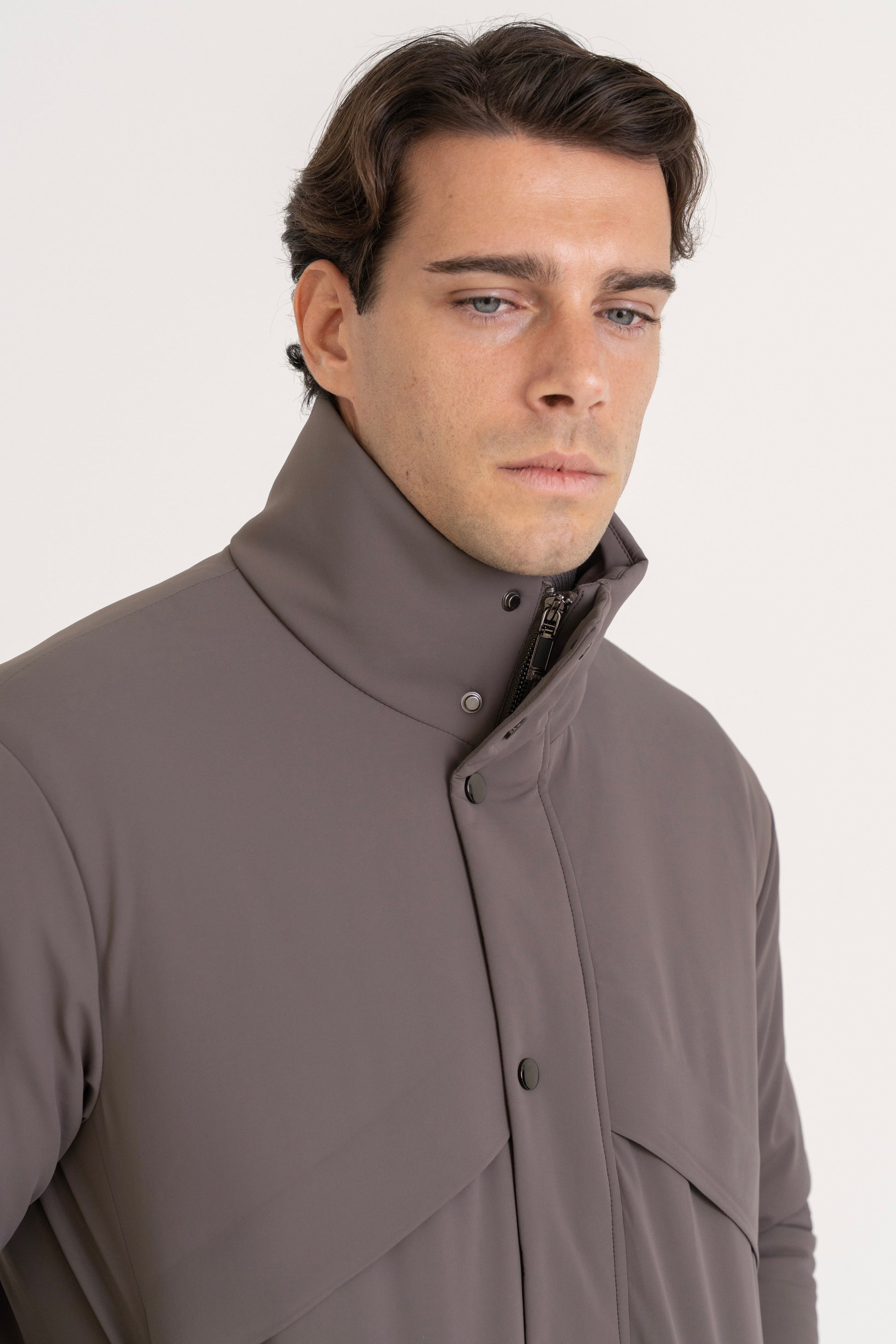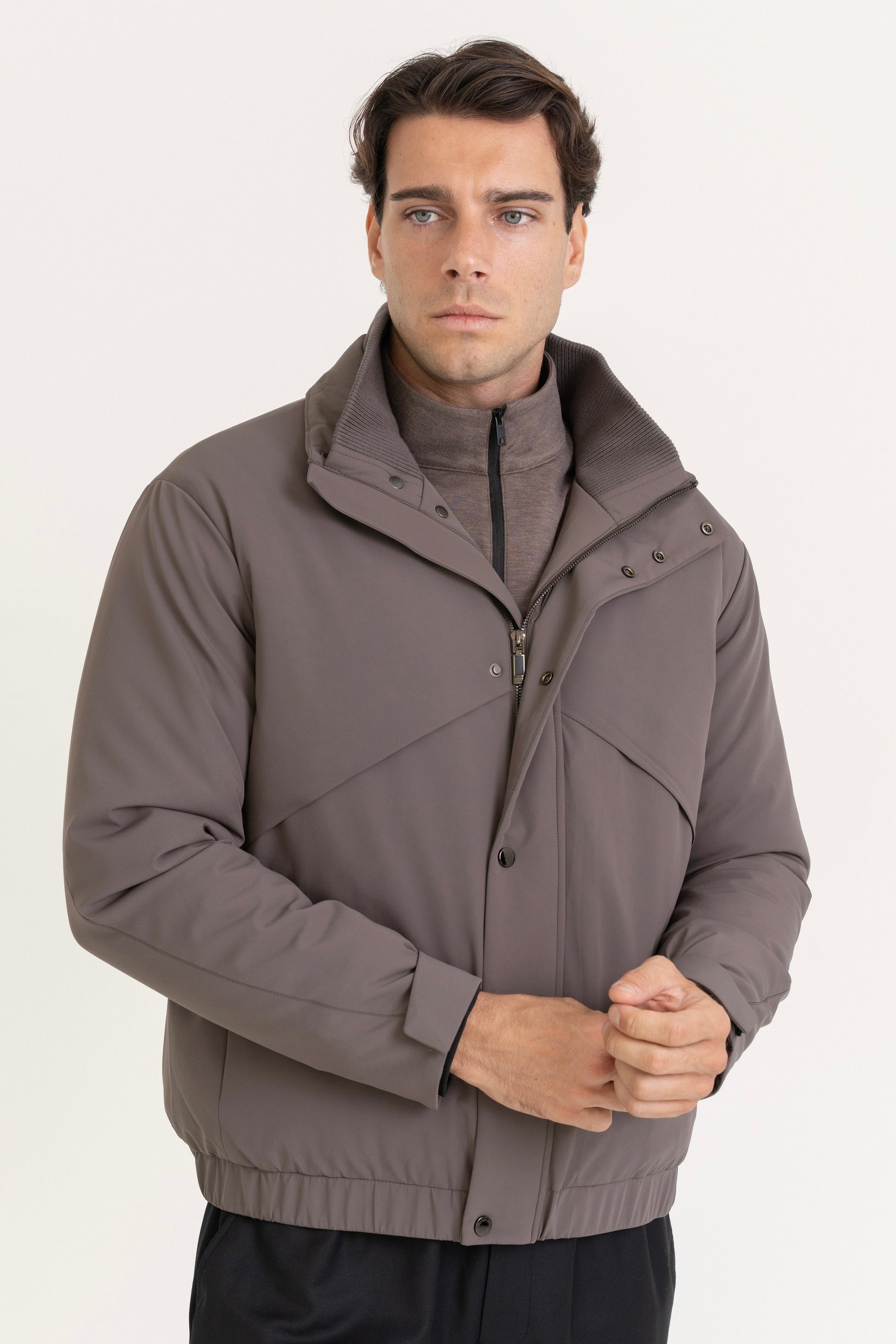 A soft ribbed stand collar adds warmth without bulk, making it ideal layered over knitwear or a simple tee. Elasticated hem and adjustable velcro cuffs maintain a fitted shape, ensuring it sits clean whether worn open or fully fastened.