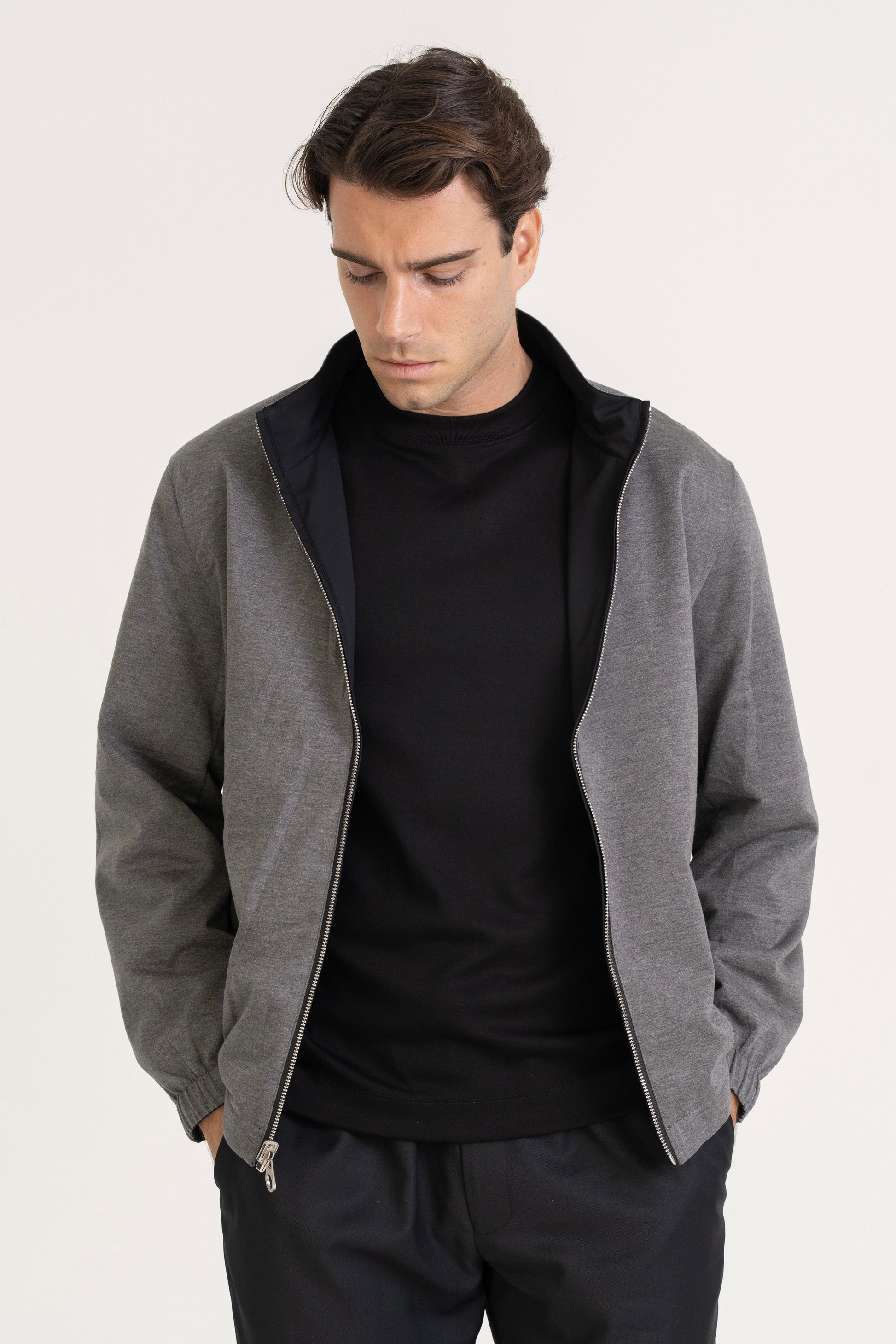Our Twin-Tech Bomber Jacket is engineered with a matte water-repellent shell and finished with a zip closure, elasticated cuffs and discreet pockets, the waistband is elasticated at the side only giving a sharp finish in the front & back. It moves effortlessly between sharp and casual - morning commute, long-haul flight or late-night walk. Switch to the cotton side and it becomes something else entirely: a laid-back layer with the ease of a sweatshirt, but the structure of a jacket.