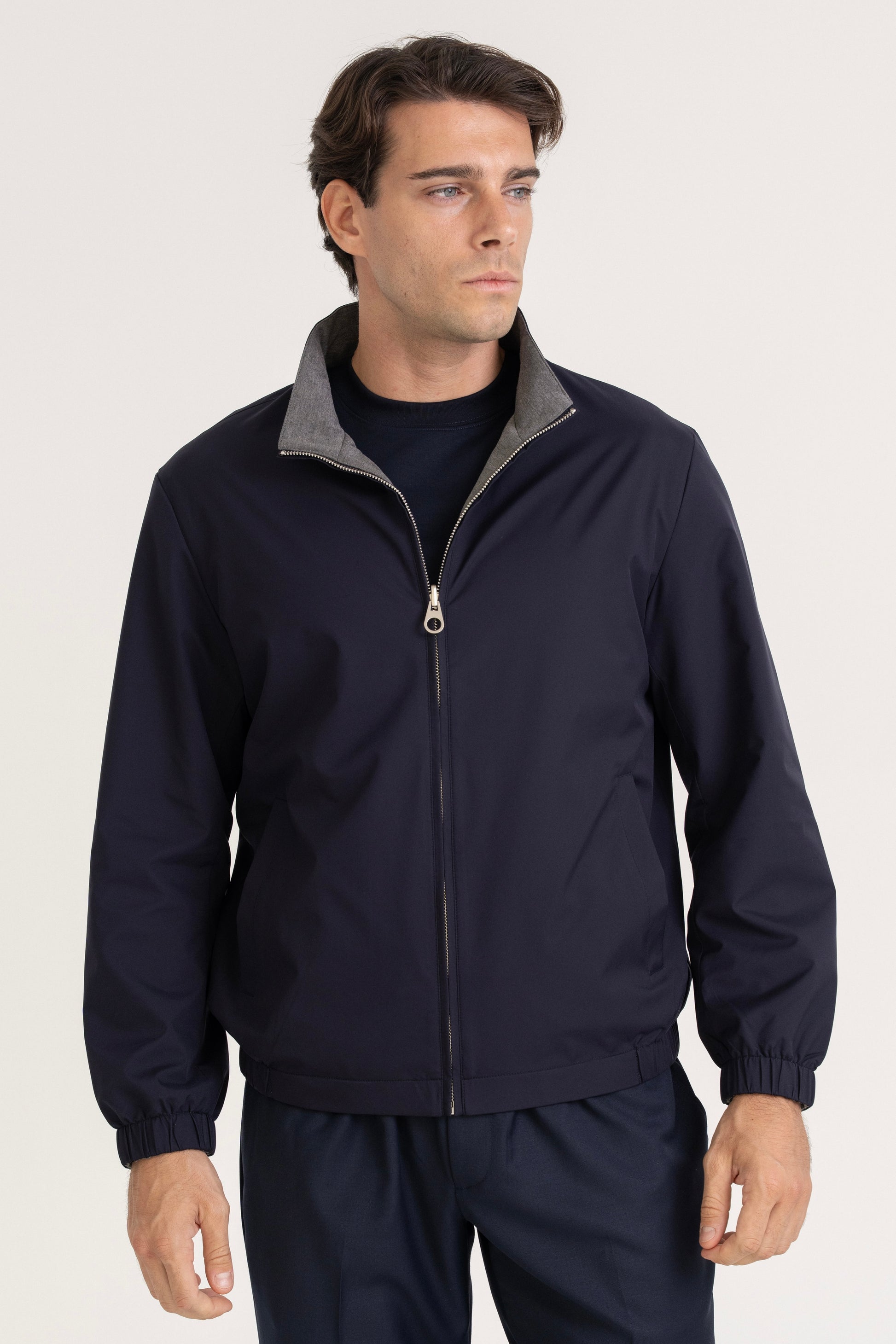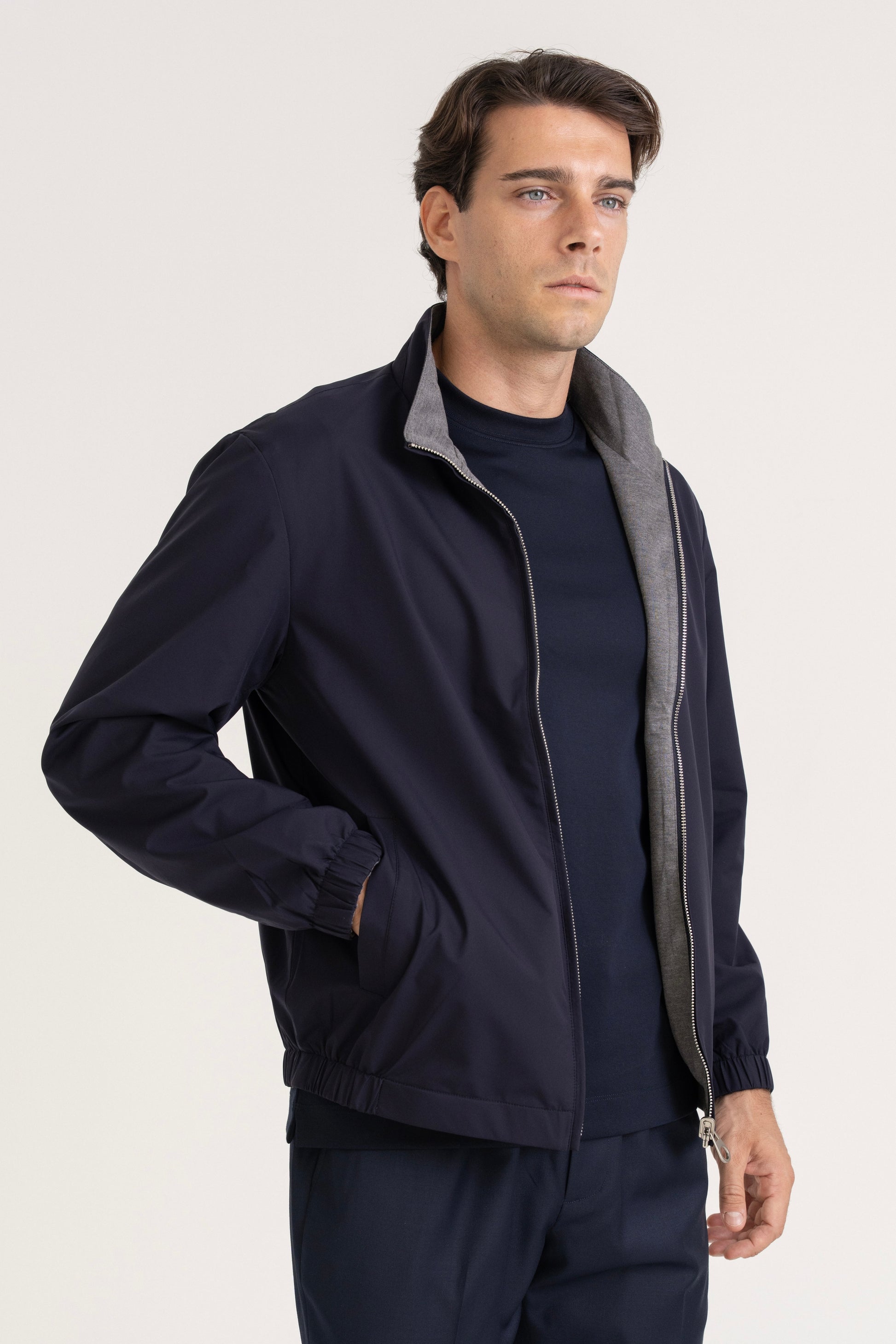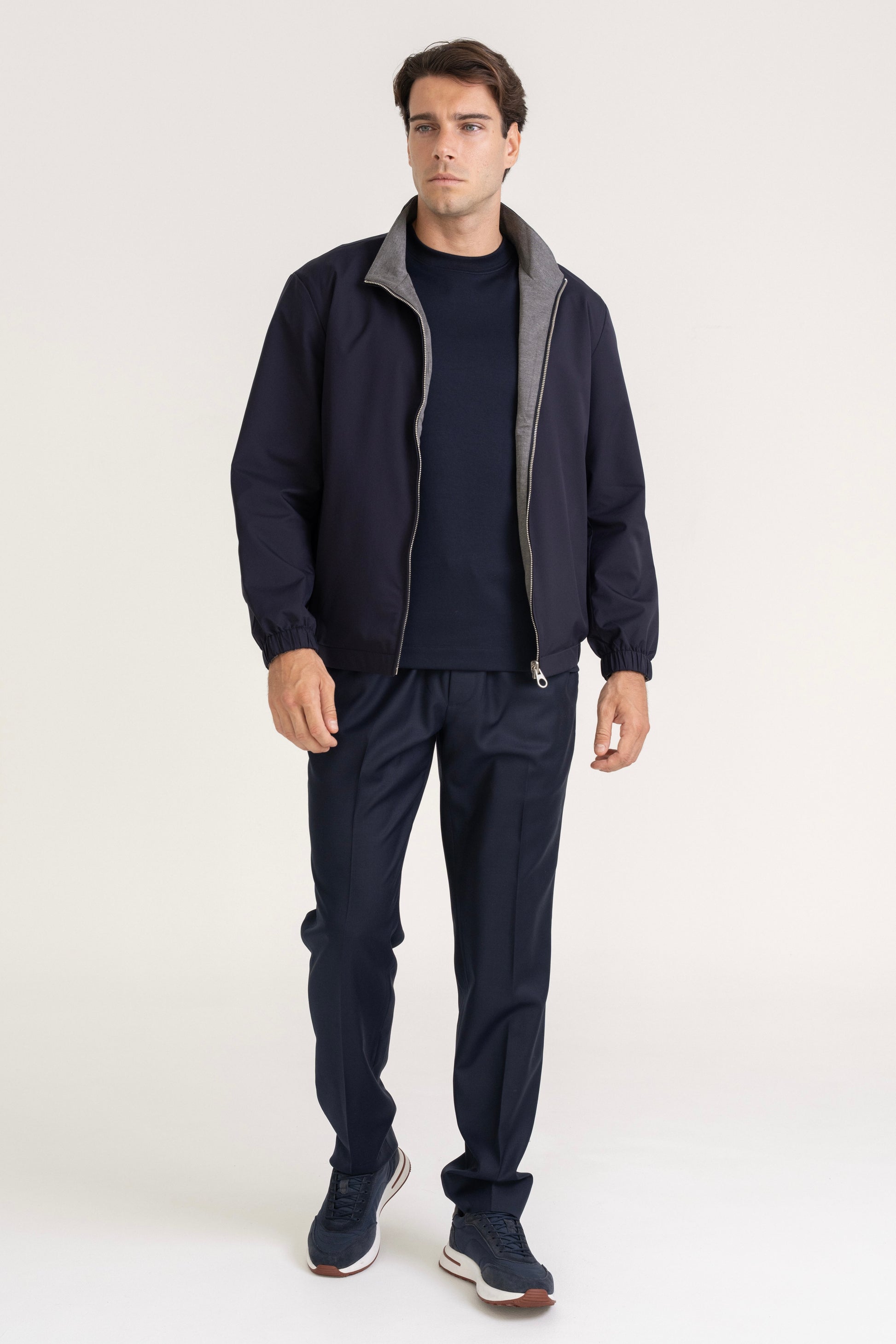 Our Twin-Tech Bomber Jacket is engineered with a matte water-repellent shell and finished with a zip closure, elasticated cuffs and discreet pockets, the waistband is elasticated at the side only giving a sharp finish in the front & back. It moves effortlessly between sharp and casual - morning commute, long-haul flight or late-night walk. Switch to the cotton side and it becomes something else entirely: a laid-back layer with the ease of a sweatshirt, but the structure of a jacket.