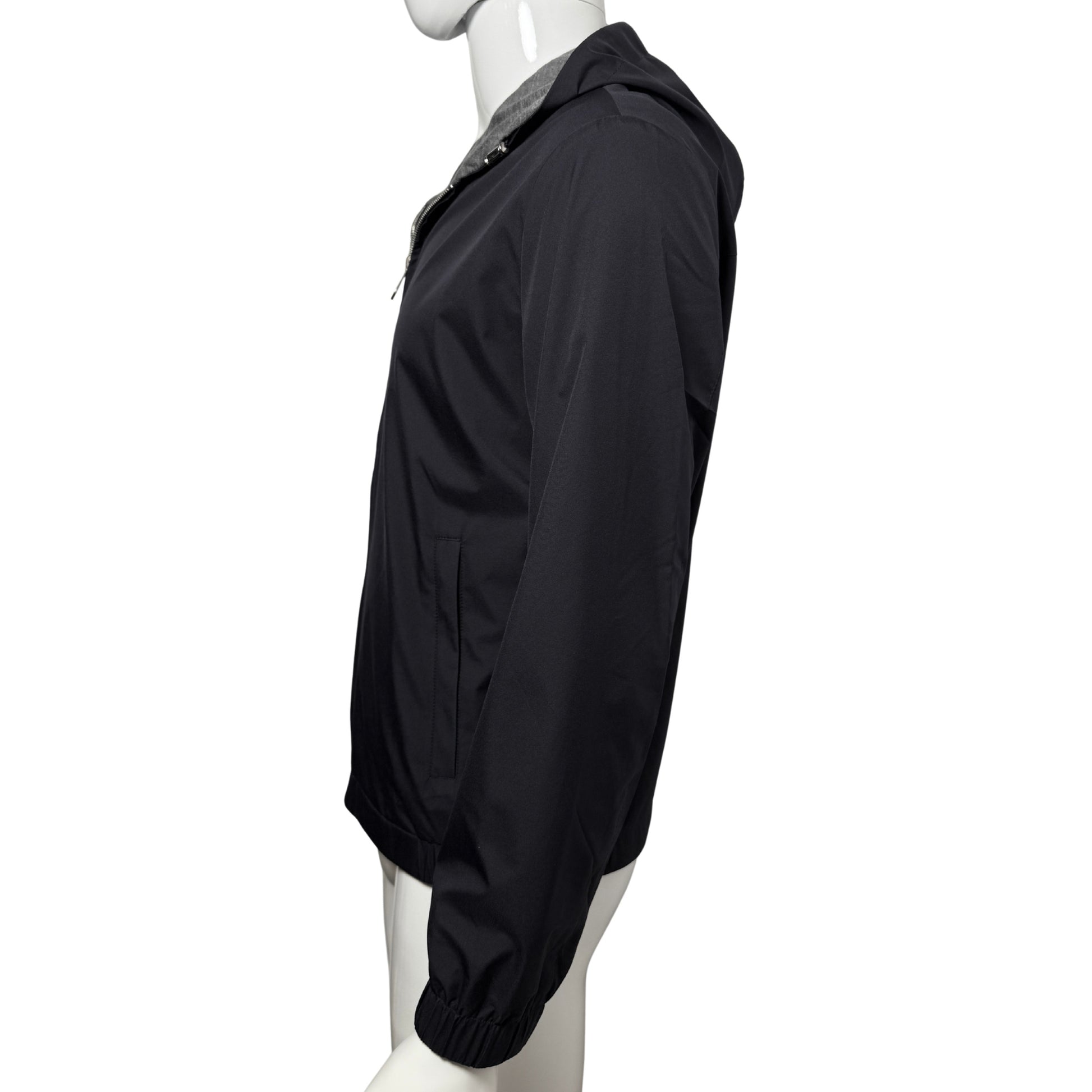Our Twin-Tech Hooded Bomber Jacket is engineered with a matte water-repellent shell, full hood and finished with a zip closure, elasticated cuffs and discreet pockets, the waistband is elasticated at the side only giving a sharp finish in the front & back. It moves effortlessly between sharp and casual - morning commute, long-haul flight or late-night walk. Switch to the cotton side and it becomes something else entirely: a laid-back layer with the ease of a sweatshirt, but the structure of a jacket.